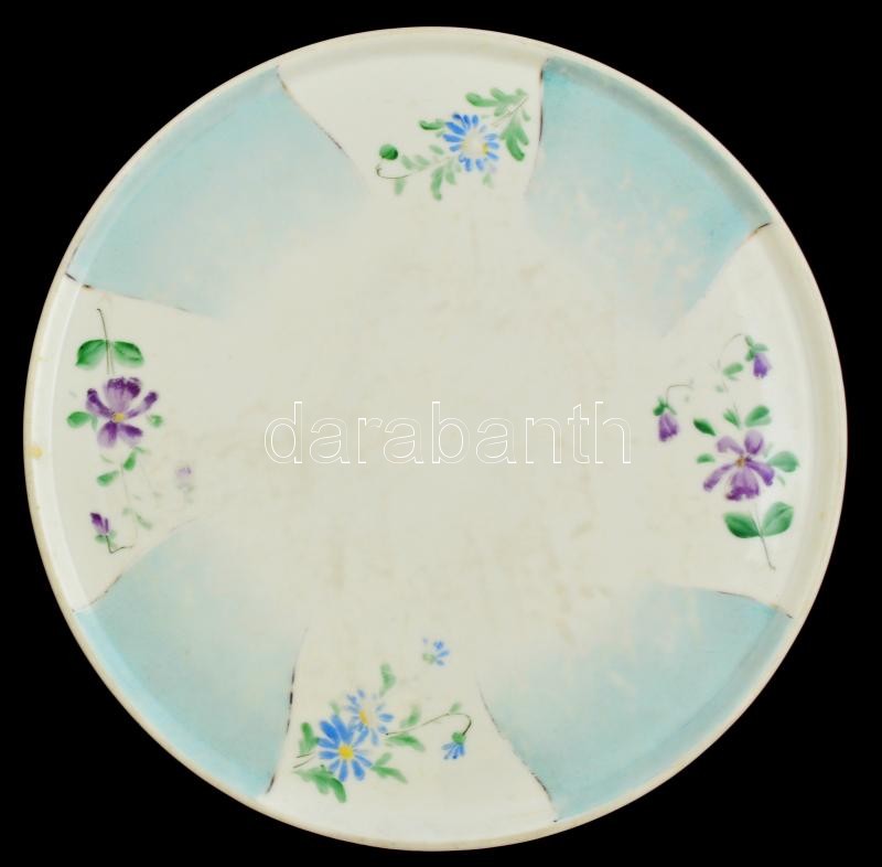 Leírás: Neumann& Jónás fiaikézzel festett kínálótál, erősen kopott, jelzett, d: 30 cm