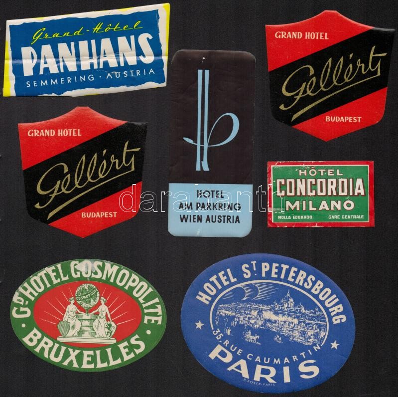 Leírás: 7 db magyar és külföldi hotelcímke, közte háború előttiek is