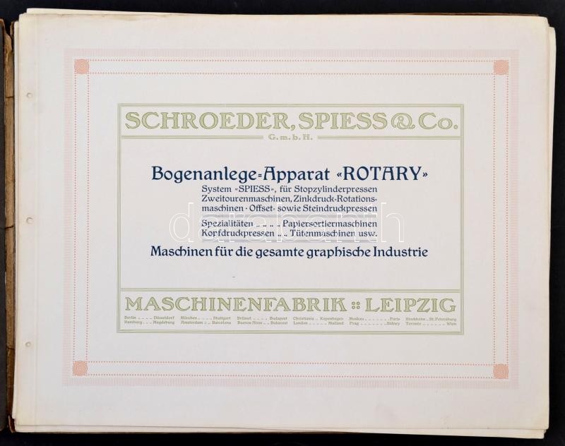 Leírás: cca 1900 Schroeder, Spiesse & Co. Rotary nyomdagépek katalógusa, színes illusztrációkkal, 24,5x31,5 cm