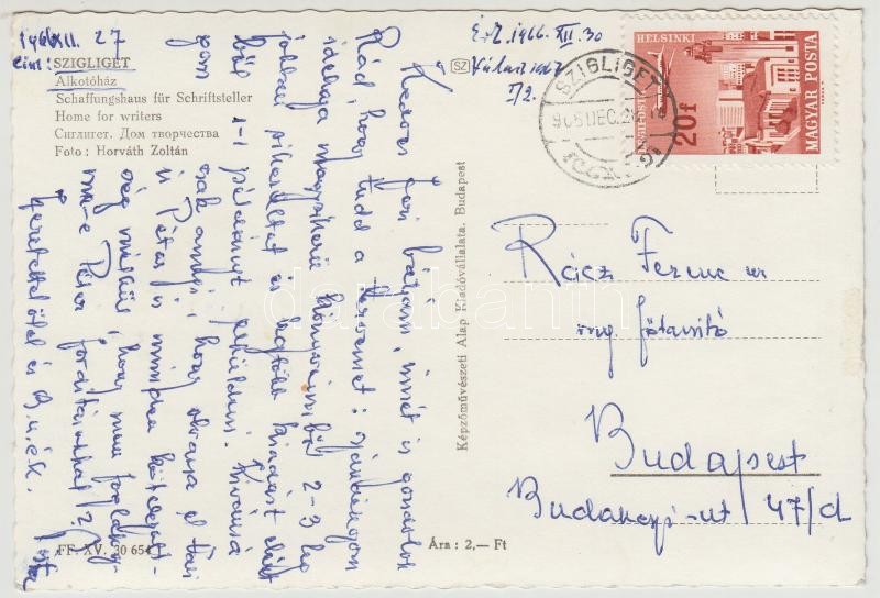 1966 Fekete István (1910-1970) által megírt képeslap, Rácz Ferencnek, göllei kántor tanítónak, Rácz Vali (1911-1997) színész- és énekesnő apjának, aki Fekete István apja után lett a község tanítója és ott tanított 1910-től 1948-ig, aláírással.