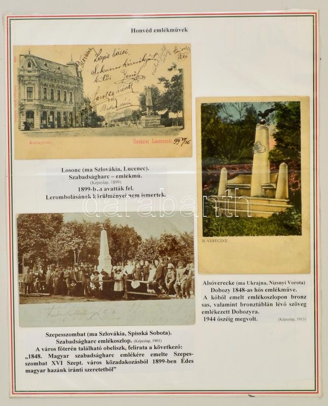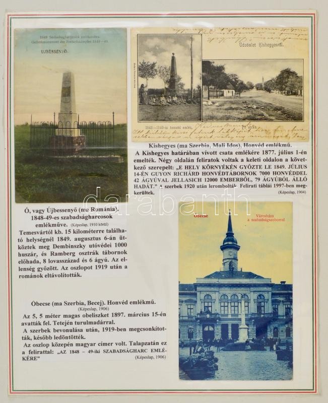 Az 1848-49-es szabadságharc emlékhelyei képeslapokon. Honvéd emlékművek, szoboravatások Szepesszombattól Désig, köztük ritka kiadások, összesen 46 db 1945 előtti és néhány későbbi képeslap 17 tablón, magyarázó szövegekkel. nagyon szép gyűjtemény.