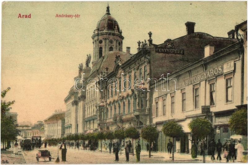 Leírás: Arad, Andrássy tér, Steigerwald A. bútorgyáros üzlete, Ravasz Imre fényképész műterme, Morgenstern fogorvos / square, shops, photographer's atelier, dentist (r)