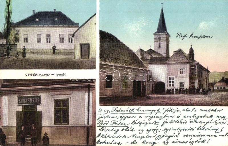 Leírás: Magyarigen, Ighiu; Református templom, utcakép, üzletek, gyógyszertár. Adler fényirda / church, shops, pharmacy, street view