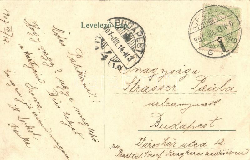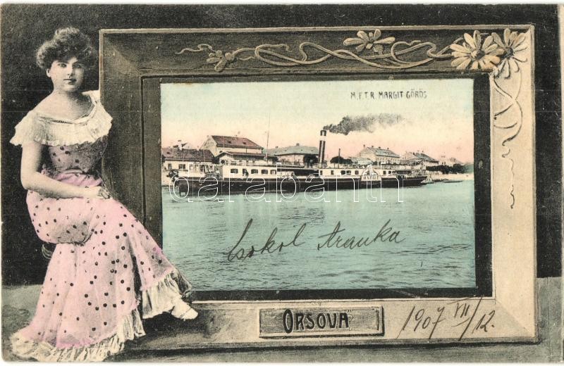 Leírás: Orsova, MFTR Margit oldalkerekes gőzhajó a kikötőben. hölgyes montázslap / Hungarian passenger steamship in the port. Art Nouveau lady montage (EK)