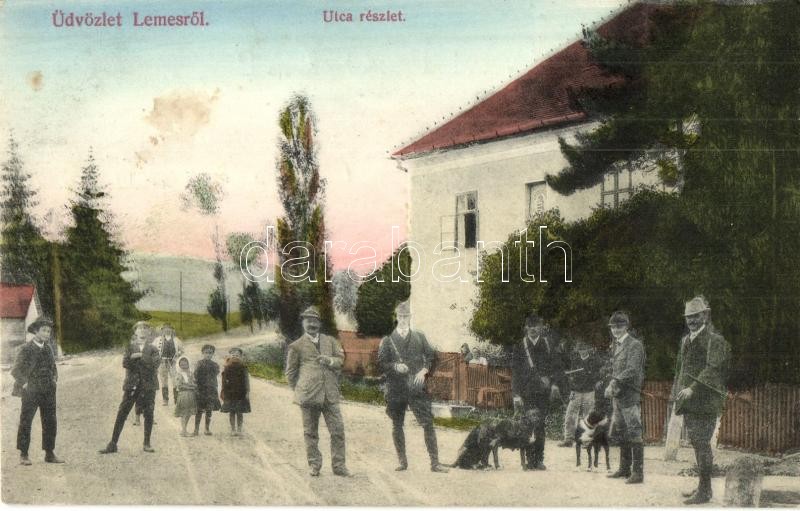 Leírás: Lemes, Lemesany; utcakép, vadászok kutyákkal. Divald Károly fia kiadása / street view, hunters with dogs (EK)