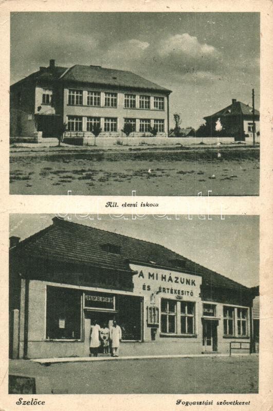 Leírás: Szelőce, Selice; Állami elemi iskola, A Mi Házunk fogyasztási szövetkezet üzlete / school, cooperative shop (EK)