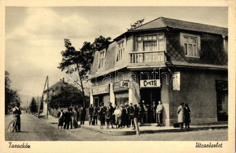 Leírás: Taracköz, Teresva; utcakép, Cikta, Weisz Henrik üzlete, kerékpár / street, shops, bicycle (EK)