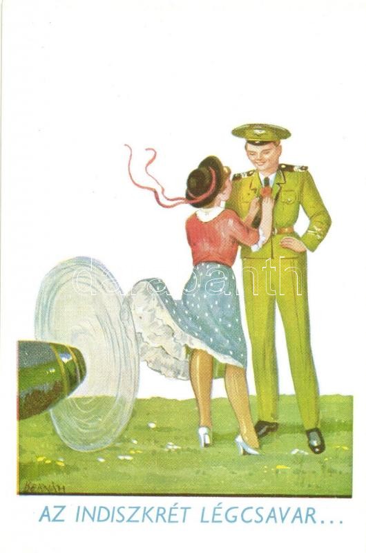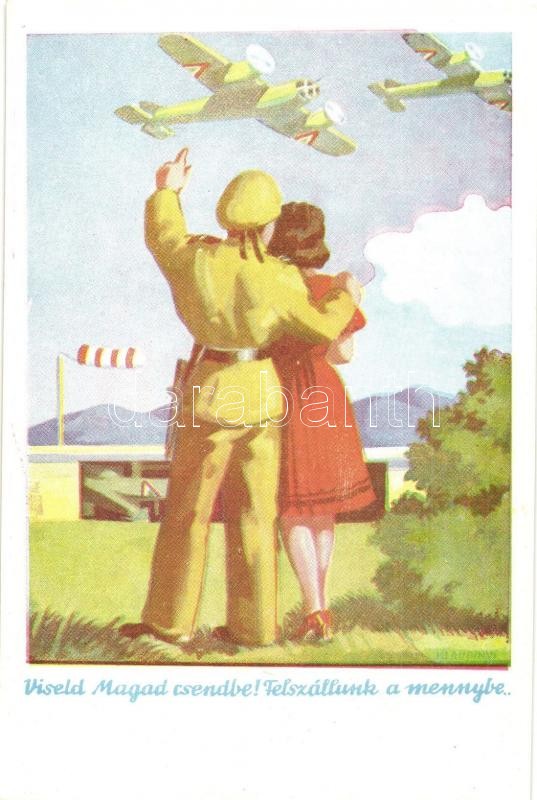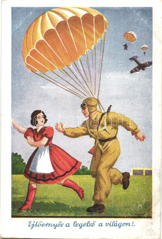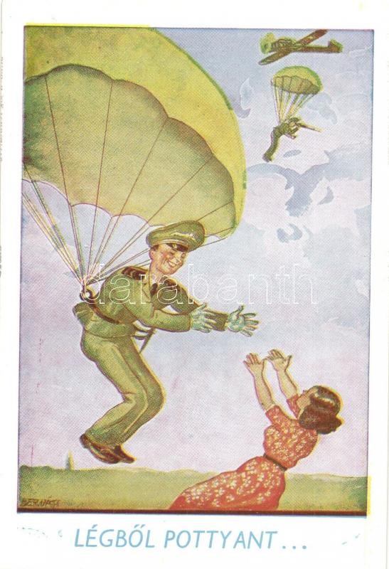 4 db humoros katonai repülős művészlap, Bernáth és Klaudinyi aláírásaival, ejtőernyő, pilóták / 4 Hungarian humorous military aircraft art postcards, pilots, paratrooper, parachute. with the signatures of Bernáth, Klaudinyi