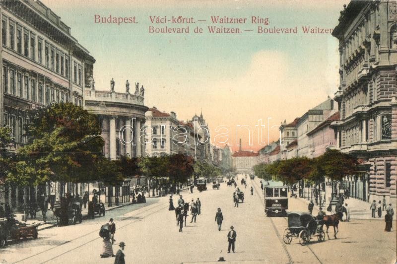 Budapest V. Váci körút, villamosok, lovaskocsi (EK) https://www.darabanth.com/hu/312-Gyorsarveres/312.0/Kepeslapok/Magyarorszag~500006/Budapest-V-Vaci-korut-villamosok-lovaskocsi-EK~II1712102