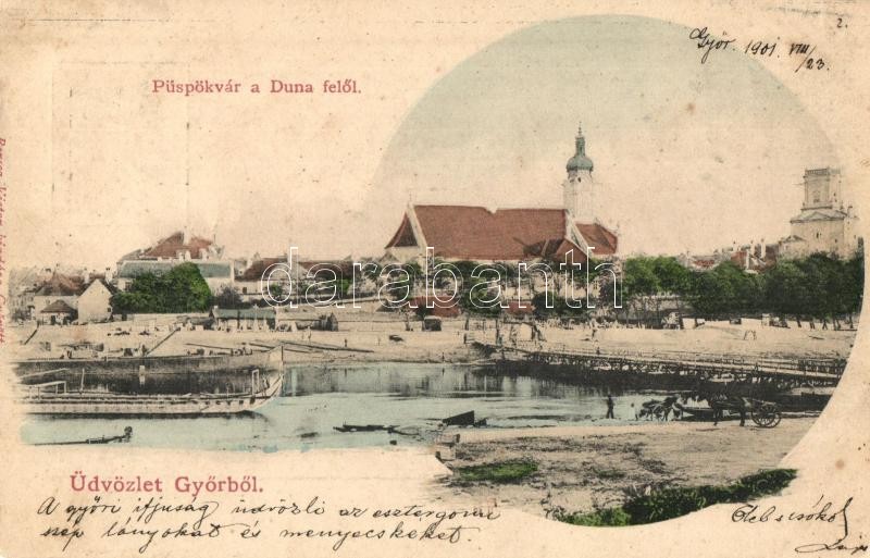 Leírás: Győr, Püspökvár a Duna felől, híd. Berecz Viktor kiadása (EK)