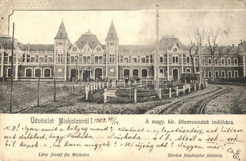 Leírás: Miskolc, Magy. kir. Államvasutak indóháza, vasútállomás, villamos. Lővy József fia kiadása, Bárdos fényképész felvétele (EK)