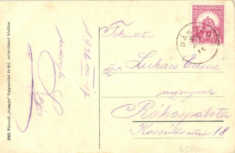 Leírás: Pákozd, Római katolikus templom, iskola és plébánia. Hangya fogyasztási szövetkezet kiadása (EK)