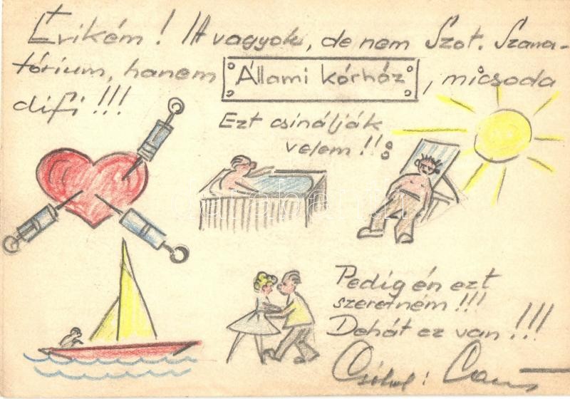 1972 Kórházi üdvözlet. kézzel rajzolt művészi lap / Greetings from the... https://www.darabanth.com/hu/312-Gyorsarveres/312.0/Kepeslapok/Muveszlapok~500038/1972-Korhazi-udvozlet-kezzel-rajzolt-muveszi-lap-Greetings-from-the-hospital-hand-drawn-a~II1707034