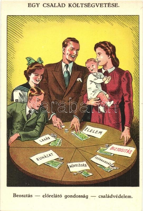 Biztosítási Napok reklámlapja. Egy család költségvetése (Beosztás - előrelátó gondosság - családvédelem) / Hungarian insurance day advertisement. A family's budget