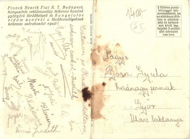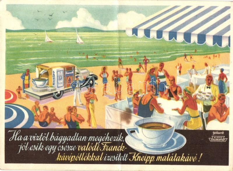 Leírás: Franck kávépótlóval ízesített Kneipp malátakávé reklám. Franck Henrik Fiai Rt. hangszórós reklámautója, Klösz Coloroffset / Hungarian malt coffee advertisement s: Gebhardt (fa)
