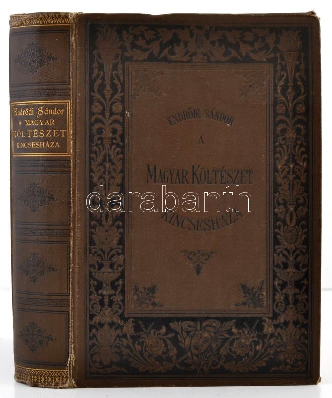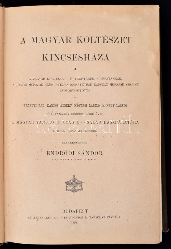 A magyar költészet kincsesháza. Szerk.: Endrődi Sándor. Bp.,[1895], Athenaeum Irodalmi és Nyomdai Rt., CXXVI (hasábszámozás,helyesen:63)+1508 (hasábszámozás, helyesen: 754)+2 p. Kiadói egészvászon kötés, kissé kopott borítóval, kissé sérült gerinccel,