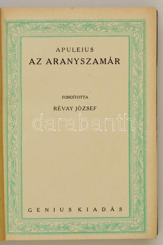 Apuleius: Az aranyszamár. Fordította Révay József. Bp., 1924, Genius. ... https://www.darabanth.com/hu/312-Gyorsarveres/312.0/Konyvek/Konyvek-Egyeb-ritkasagok~300016/Apuleius-Az-aranyszamar-Forditotta-Revay-Jozsef-Bp-1924-Genius-294-p-Kiadoi-egeszvas~II1709907