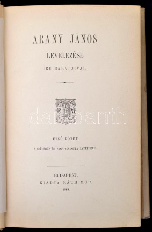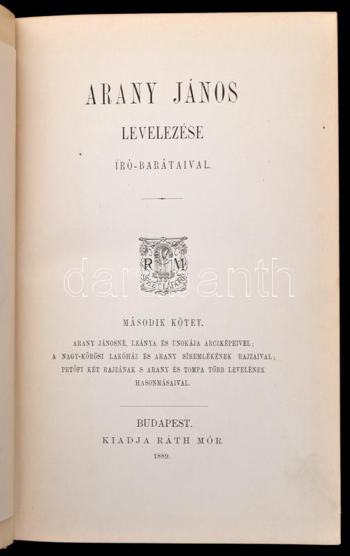 Arany János levelezése író-barátaival. I-II. kötet. Bp.,1888-1889, Ráth Mór. Kiadói aranyozott, festett egészvászon-kötés, aranyozott lapélekkel, kissé kopott, kissé foltos borítóval, kissé sérült gerinccel, a II. kötet elülső szennylapja szakadt.