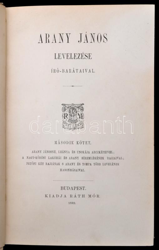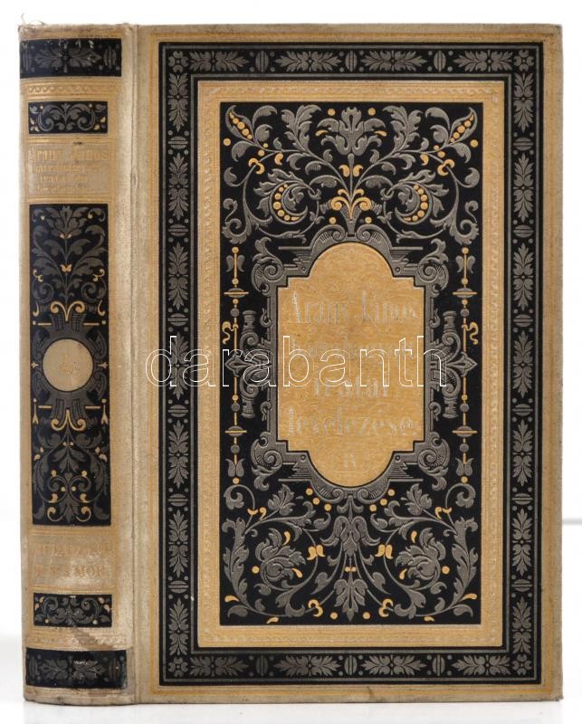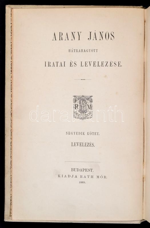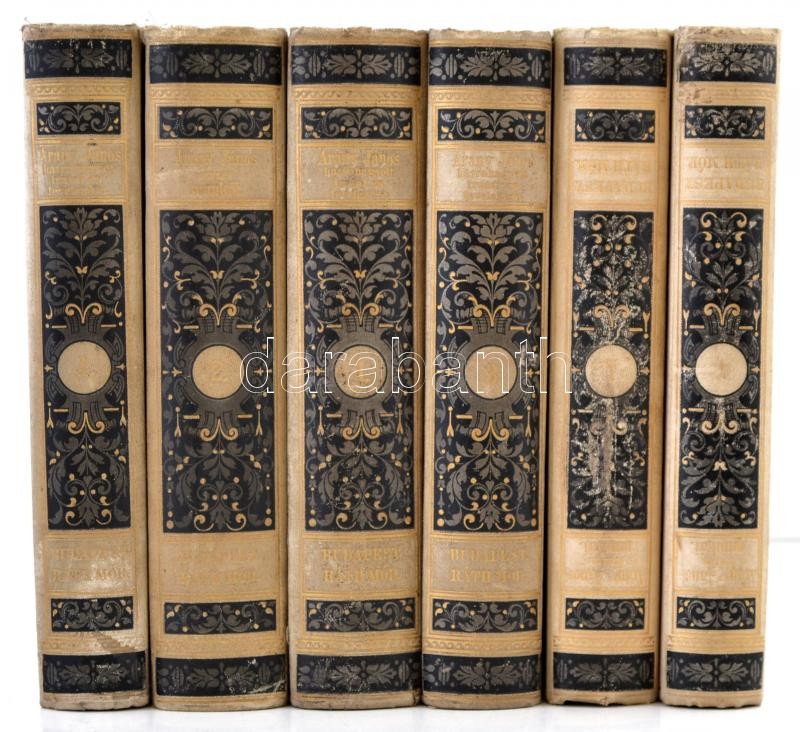 Arany János összes munkái 1-2.,4. kötetek. + Arany János hátrahagyott iratai és levelezése 1.,3.,4. kötetek. Összesen hat kötet. Bp.,1883-1888, Ráth Mór. Kiadói aranyozott, festett egészvászon-kötés, márványozott lapélekkel, kissé kopott, kissé foltos borítóval, két kötet lapélein ceruzás írással.