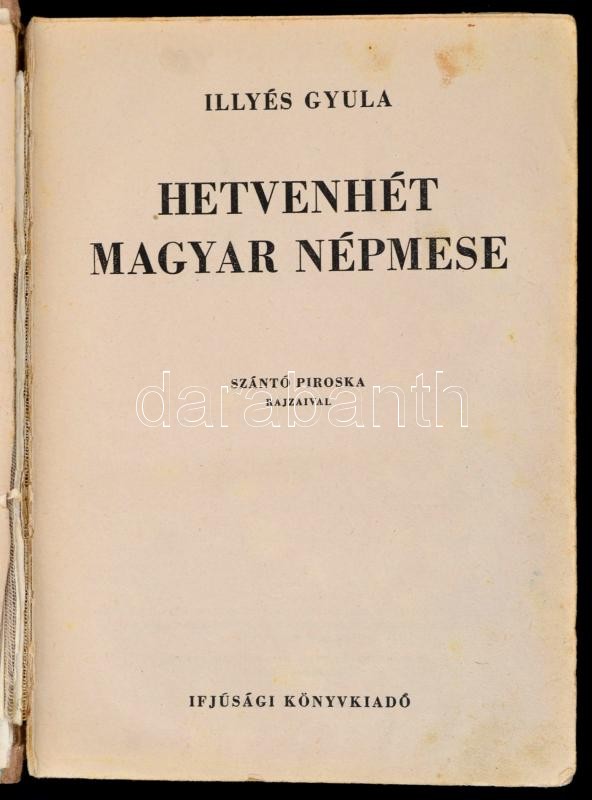Illyés Gyula: Hetvenhét magyar népmese. Szántó Piroska rajzaival. Bp., 1953, Ifjúsági Könyvkiadó. Kiadói félvászon-kötés, megviselt állapotban, kopott borítóval, a szennylapok és két lap kijár. (461-462., 475-476.) Első kiadás.