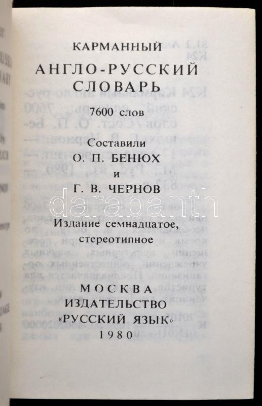 Pocket Russian-English, English-Russian Dictionary. Szerk.: O.P.Benyuch, G.V: Chernov. Moszkva, 1979, Russian Language Publishers. Kiadói egészvászon-kötésben, angol és orosz nyelven.