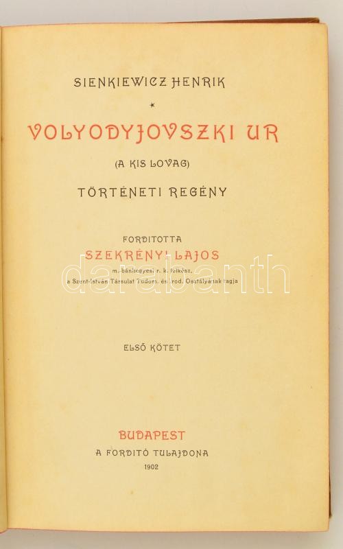 Sienkiewicz Henrik: Volyodyjovszki úr. (A kis lovag.) 1-2. kötet. Fordította: Szekrényi Lajos. Bp.,1902, Fordító, (Stephanaeum-ny.),290+283+1 p. Kiadói, díszesen festett, aranyozott, szecessziós virágornamentikával díszített egészvászon kötésben, Gottermayer-kötés, a könyv sarkainál, és a gerinc szélein kopásnyomokkal, az első kötetben a címoldalt követő két lapon szakadással, a festett lapélekkel.