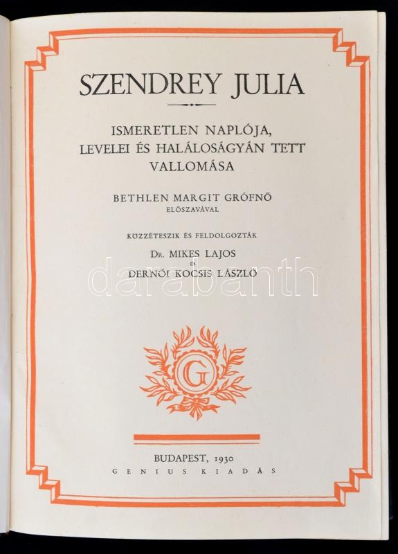 Szendrey Julia ismeretlen naplója, levelei és halálos ágyán tett vallomása. Bethlen Margit grófnő előszavával. Közzéteszik és feldolgozták Mikes Lajos és Dernői Kocsis László. Bp., 1930, Genius, 1t.+400p., 23 t.+8 t. (facsimilék). Átkötött félvászon-kötés, egy hiányzó illusztrációval.