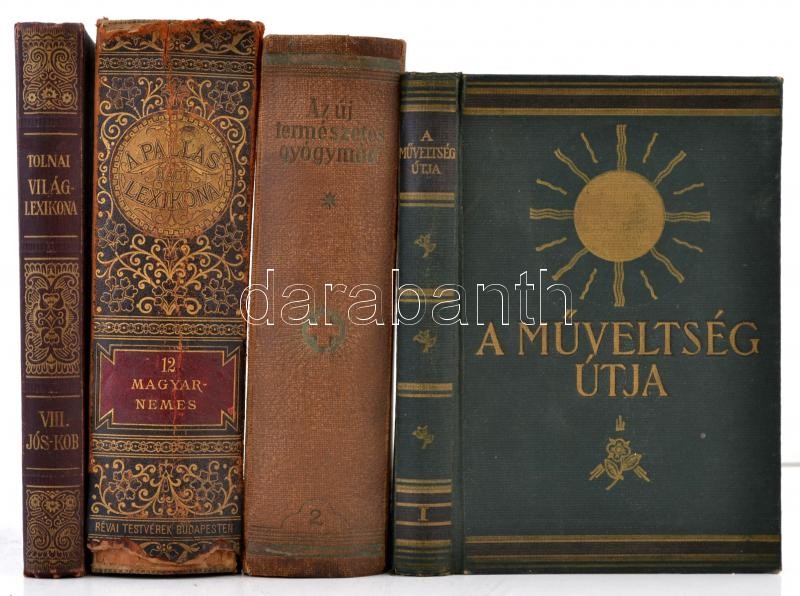 Vegyes könyvtétel, 4 db: Bilz F. E.: Az új természetes gyógymód. 2. kötet. Leipzig, én., Dr. Karl Meyer. Kiadói félvászon-kötés, megviselt állapotban, kopottas borítóval, sérült kötéssel, kijáró lapokkal. A műveltség útja I. kötet. Bp.,é.n., Tolnai. Kiadói egészvászon-kötés. Tolnai Uj Világlexikona VIII. kötet. Bp.,1927, Tolnai. Kiadói félvászon-kötés. Pallas Nagy Lexikona XII. kötet. Bp.,1896,Pallas. Kiadói félbőr-kötés, sérült gerinccel, kopott borítóval, kijáró lapokkal.