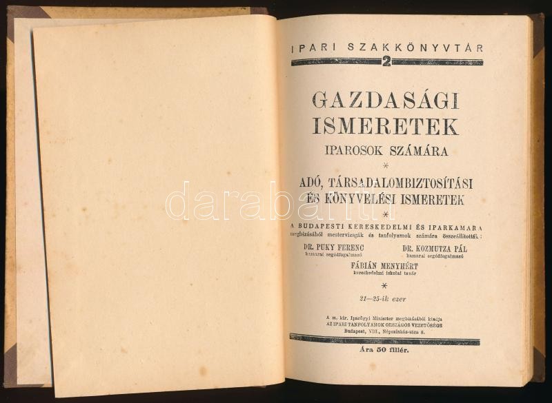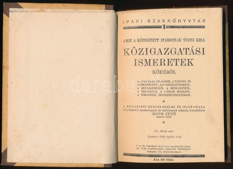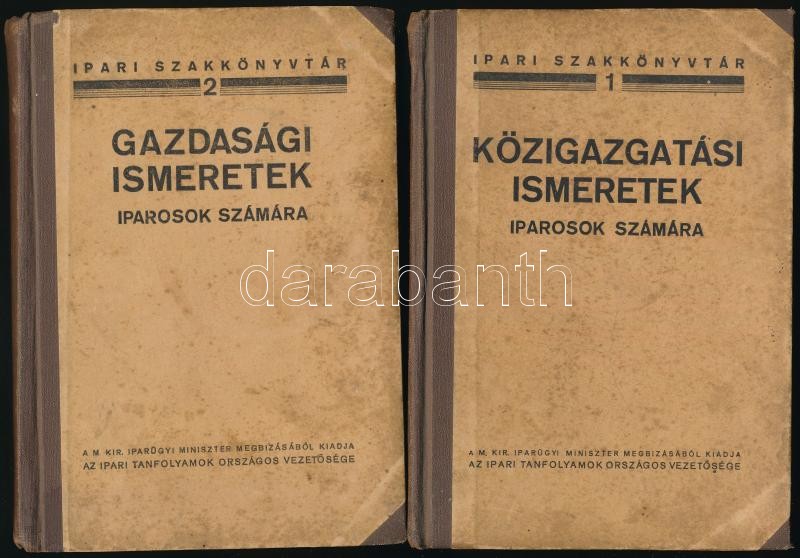 Amit a képesített iparosnak tudni kell közigazgatási ismeretek köréből 1-2. Szerk.: Moór Jenő, Dr. Puky Ferenc, Dr. Kozmutza Pál, Fábián Menyhért. Ipari szakkönyvtár 1-2. Bp.,é.n. (cca 1937-1938), Ipari Tanfolyamok Országos Vezetősége. Kiadói félvászon kötés, kissé kopottas, kissé foltos borítóval.