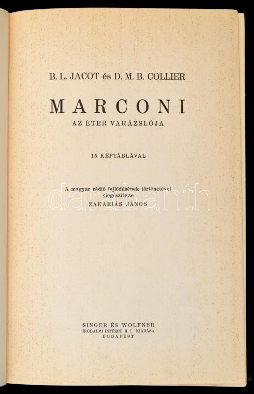 Leírás: Jacot, B. L. - Collier, D. M. B.: Marconi, az éter varázslója. Bp., é. n., Singer és Wolfner. Vászonkötésben, jó állapotban.