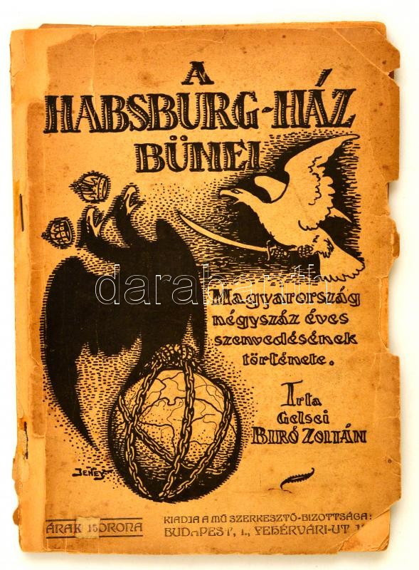 Gelsei Bíró Zoltán: A Habsburg-ház bűnei. Magyarország négyszázéves szenvedésének története. Bp.,1919, "Pátria", 96 p. Kiadói papírkötés, a borítója szakadt, sérült, elvált a könyvtesttől.
