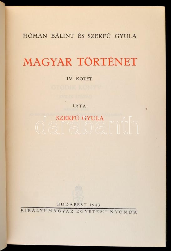 Hóman Bálint, Szekfű Gyula: Magyar történet. I-V. köt. Bp., 1941-1943, Királyi Magyar Egyetemi Nyomda. Hetedik kiadás. Kiadói félbőr-kötésben, kopott, kissé sérült gerinccel.