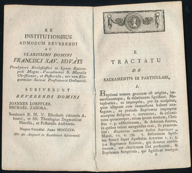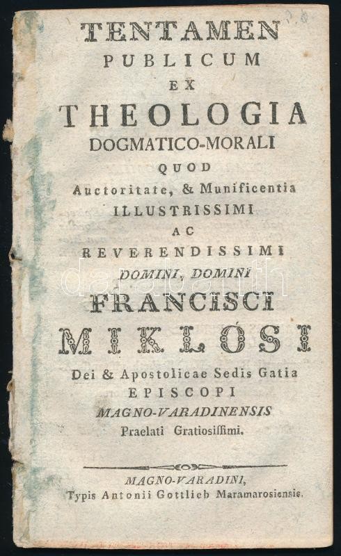 Kováts Ferenc Xaver (1743-1810): Tentamen Publicum, ex Theologia Dogmatico-Morali. Quod Auctoritate, & Munificentia Illustrissimi, ac Reverendissimi. Domini, Domini Francisci Miklósi Dei, & Apostolicae Sedis G(r)atia Episcopi Magno-Varadienensis, Praelati Gratiosissimi. E Tractatu de Sacramentis in Particulari. Magno-Varadini (Nagyvárad),(1804), Typis Antonii Gottlieb Maramarosiensis (Máramarosi Gottlieb Antal), 1 sztl. lev.+35 p. Fűzött papírkötés, latin nyelven.