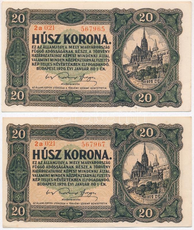 1920. 20K (2x) közeli sorszám T:II https://www.darabanth.com/hu/312-Gyorsarveres/312.0/Numizmatika/Magyar-bankjegyek~400007/1920-20K-2x-kozeli-sorszam-TII~II1712046