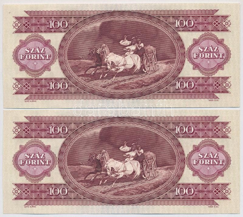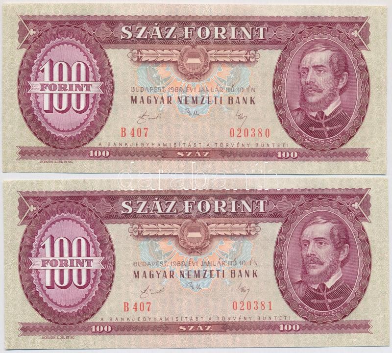 1989. 100Ft (2x) sorszámkövetők T:I- https://www.darabanth.com/hu/312-Gyorsarveres/312.0/Numizmatika/Magyar-bankjegyek~400007/1989-100Ft-2x-sorszamkovetok-TI-~II1705140