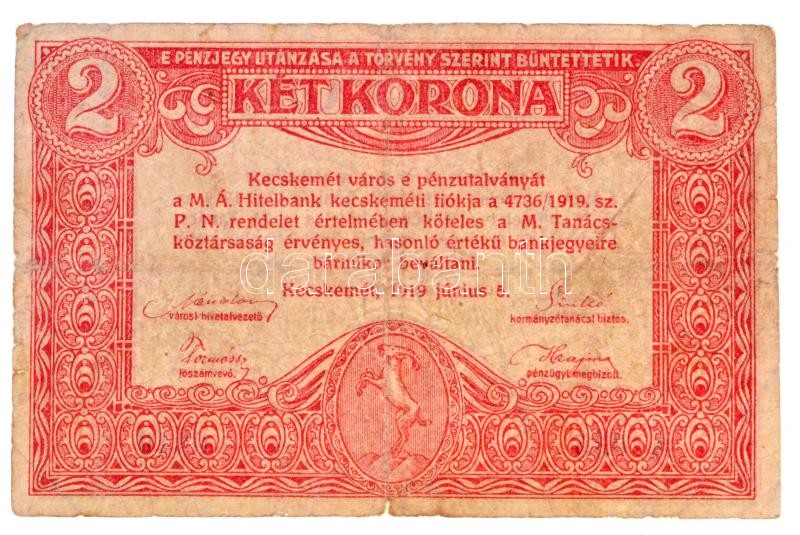 Leírás: Kecskemét 1919.06.05. 2K pénzutalvány T:III-