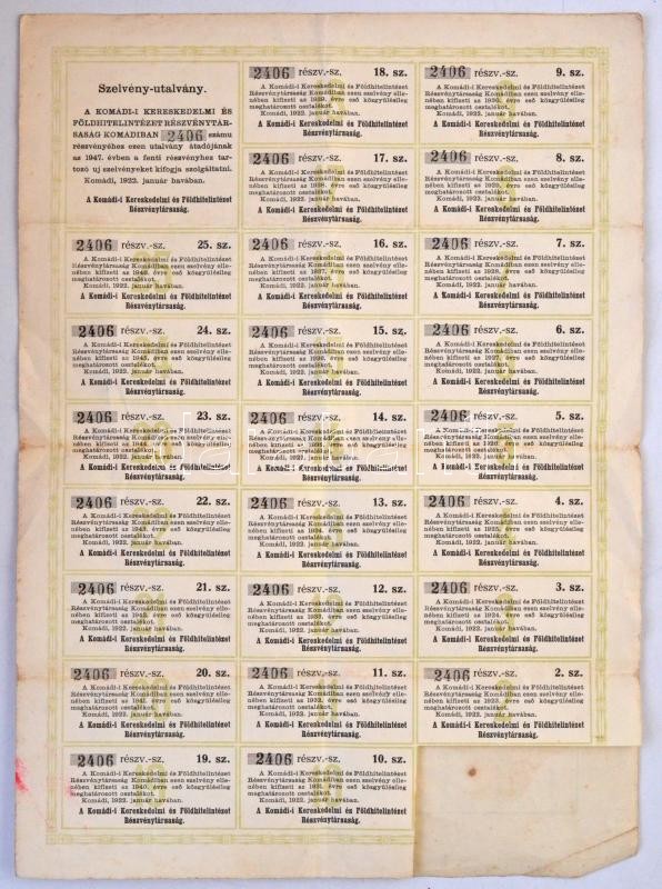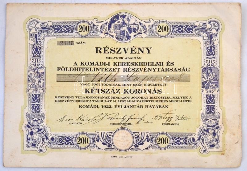 Komádi 1922. "A Komádi-i Kereskedelmi és Földhitelintézet Részvénytársaság" névre szóló részvénye 200K-ról, szárazpecséttel, szelvényekkel T:III,III- fo.