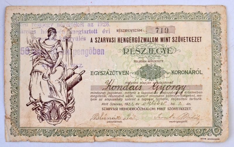 Leírás: Szarvas 1922. "A szarvasi hengergőzmalom mint szövetkezet" névre szóló részjegye 150 koronáról, felülbélyegzéssel, szelvényekkel T:III- szakadások