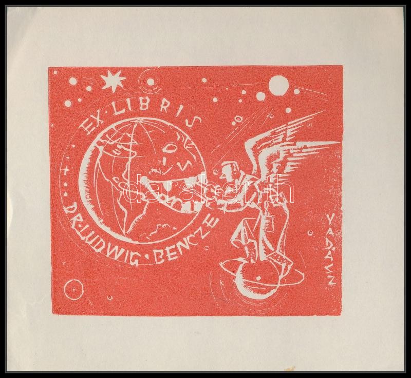 Leírás: Vadász Endre (1901-1944): Ex libris Ludwig Bence. Színes fametszet, papír, jelzett a dúcon, 6,5×7,5 cm