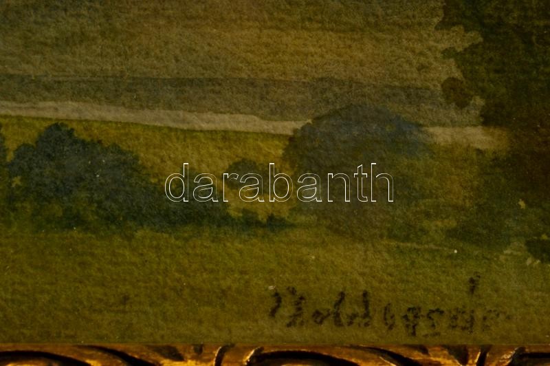 Leírás: Boldizsár jelzéssel: Táj, akvarell, papír, üvegezett fa keretben, 23,5×26,5 cm