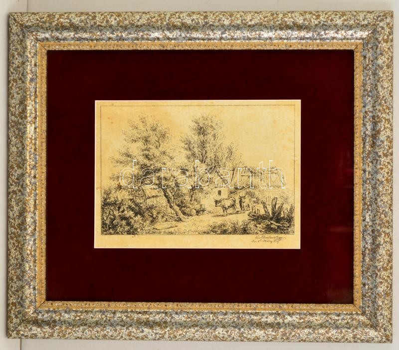 Leírás: Dorfmeister jelzéssel: Tehenek, ceruza, papír, paszpartuban, üvegezett fa keretben, 15,5×22 cm