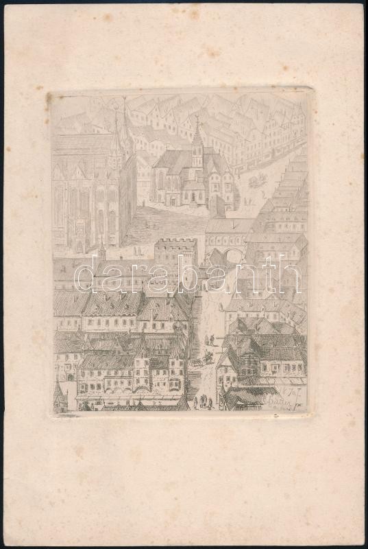 Leírás: Emil Hütter (1835-1886): Városkép, rézkarc, papír, jelzett a rézkarcon, 15,5×13 cm