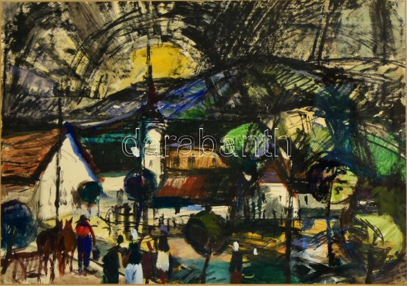 Leírás: Göldner Tibor (1929-): Falu a dombok alatt. Vegyes technika, papír, jelzett, üvegezett keretben, 40×60 cm