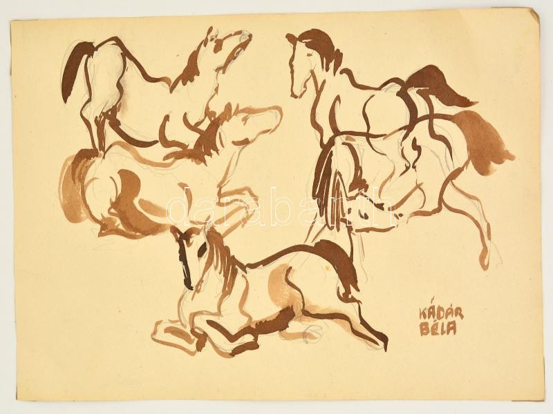 Kádár jelzéssel: Lovak. Akvarell, papír, 23×32 cm https://www.darabanth.com/hu/313-Gyorsarveres/313.0/Festmeny-mutargy-papirregiseg-egyeb/Festmenyek-es-grafikak~1/Kadar-jelzessel-Lovak-Akvarell-papir-23C39732-cm~II1715440