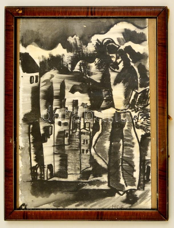 Leírás: MCP jelzéssel: Nagyváros. Tus, papír, üvegezett keretben, 23×18 cm