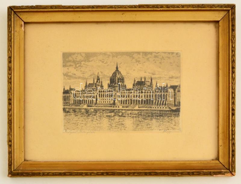 Leírás: Olvashatatlan jelzéssel: Budapest Országház. Rézkarc, papír, üvegezett keretben, 8,5×13 cm