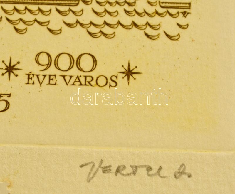 Leírás: Vertel József (1922-1993): Vác 900 éve város, rézkarc, papír, jelzett, 10,5×11,5 cm