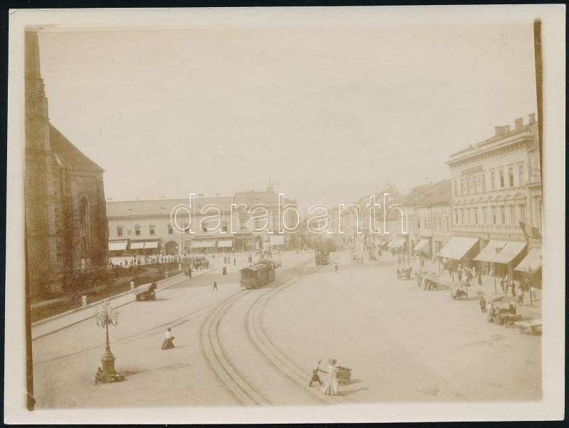 cca 1910 Korai villamos ábrázolás vintage fotón és a Fonciére Pesti Biztosító Intézet, a villamos mögött levő épületen magyar nyelvű cégfelirat, 9x12 cm