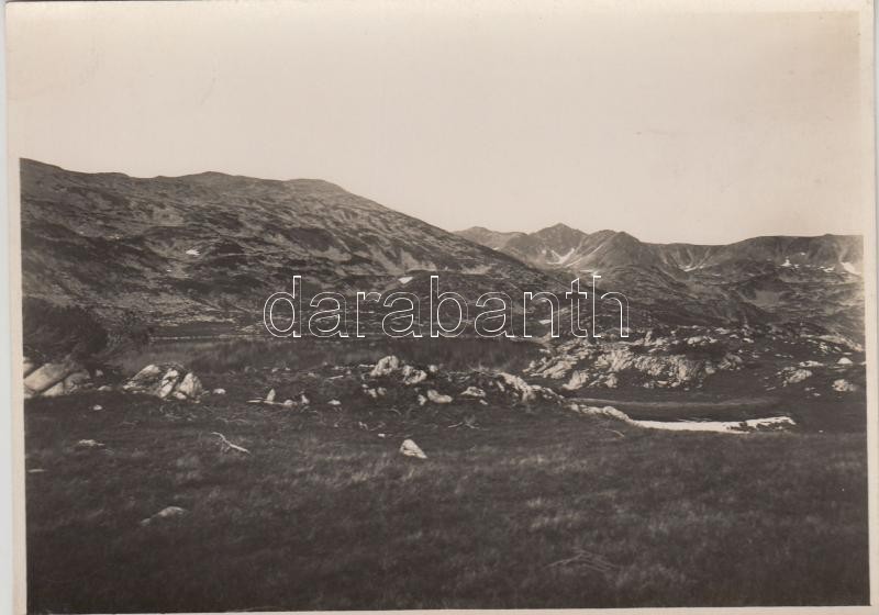 cca 1910 Retyezát, a Zanoga-tó, Erdélyi Mór felvétele, hátulján feliratozva, pecséttel jelzett, 11,5×16 cm / cca 1910 Munţii Retezat, Lake Zănoaga Mare, vintage photo, with notes on its back, 11,5×16 cm