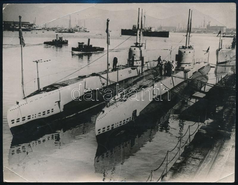 Leírás: cca 1935 Két német tengeralattjáró fotója, sajtófotó, Keystone, a hátoldalán pecséttel jelzett, a felületén gyűrődésekkel, 15x20 cm